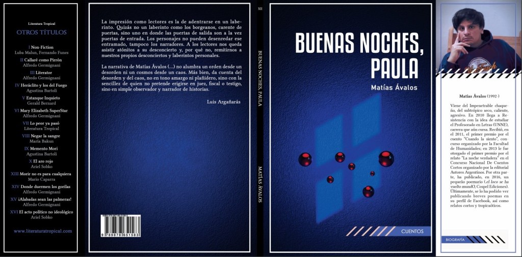 Matías Ávalos (1992) viene del Impenetrable chaqueño, del subtrópico seco, caliente, agresivo. En 2010 llega a Resistencia con la idea de estudiar el Profesorado en Letras (UNNE), carrera que aún cursa. Recibió, en el 2011, el primer premio por el cuento Cuando la siento, concurso organizado por la Facultad de Humanidades; en 2013 le fue otorgado el primer premio por el relato La noche verdadera en el Concurso Nacional De Cuentos Cortos organizado por la editorial Autores Argentinos. Por otra parte, ha publicado, en 2016, un pequeño poemario (.el loco se ha vuelto mundO, Cospel Ediciones). Últimamente, se lo ha podido ver publicando breves poemas en su perfil de Facebook, así como relatos cortos y tropicaóticos.