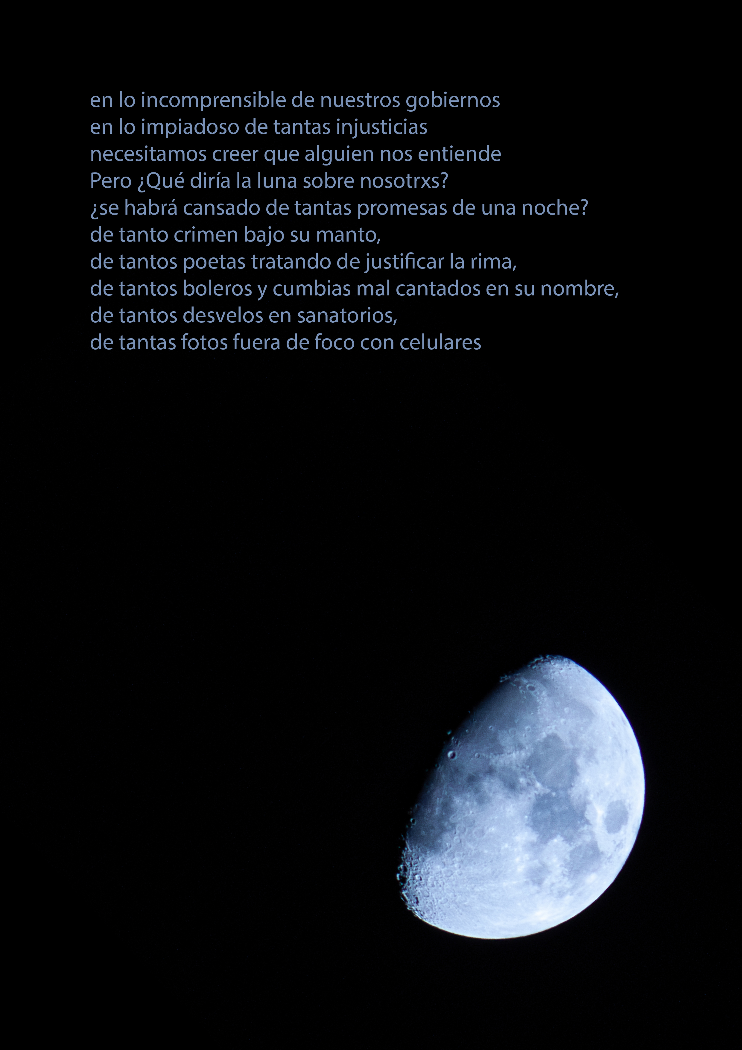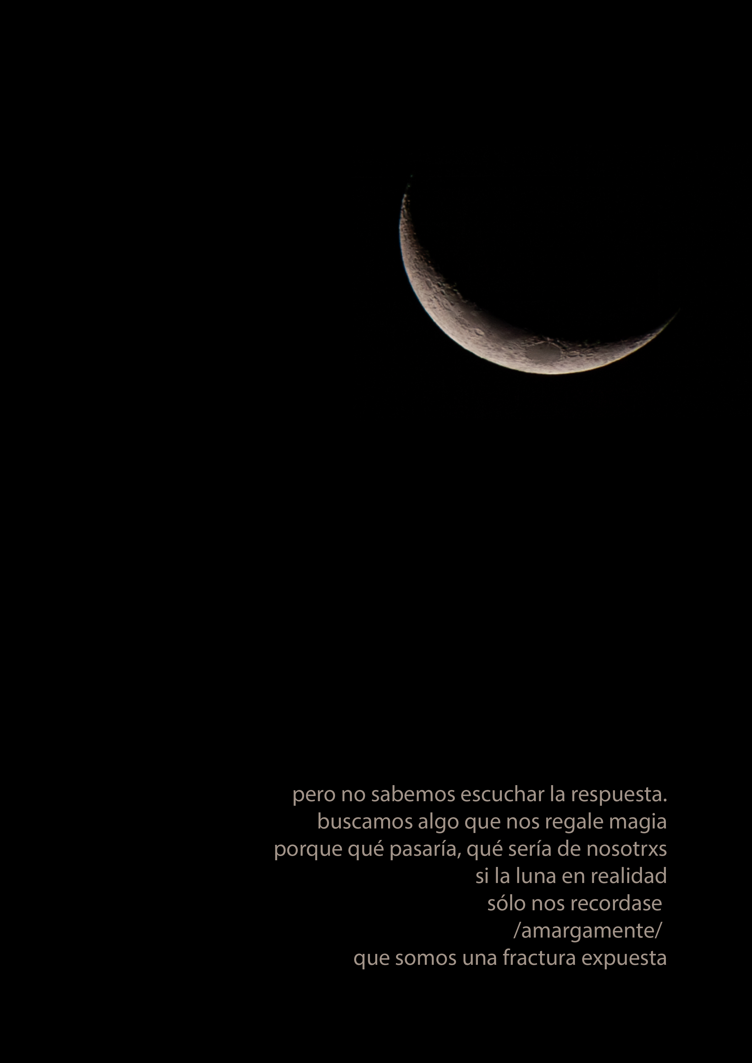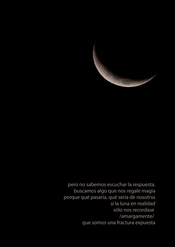 La poesía de Lefi Ramírez y las fotografías de Laura A. Aguirre nos confrontan con nuestra búsqueda de significado bajo la luna. Reflejan anhelos y frustraciones, un diálogo entre incomprensibles verdades y salvatajes de amor. La luna, símbolo de esperanza y desilusión, nos invita a cuestionar si realmente encontramos respuestas en su lumbre espesa. En un mundo lleno de injusticias, miramos al cielo buscando consuelo, mientras la poesía nos recuerda nuestras fracturas expuestas.