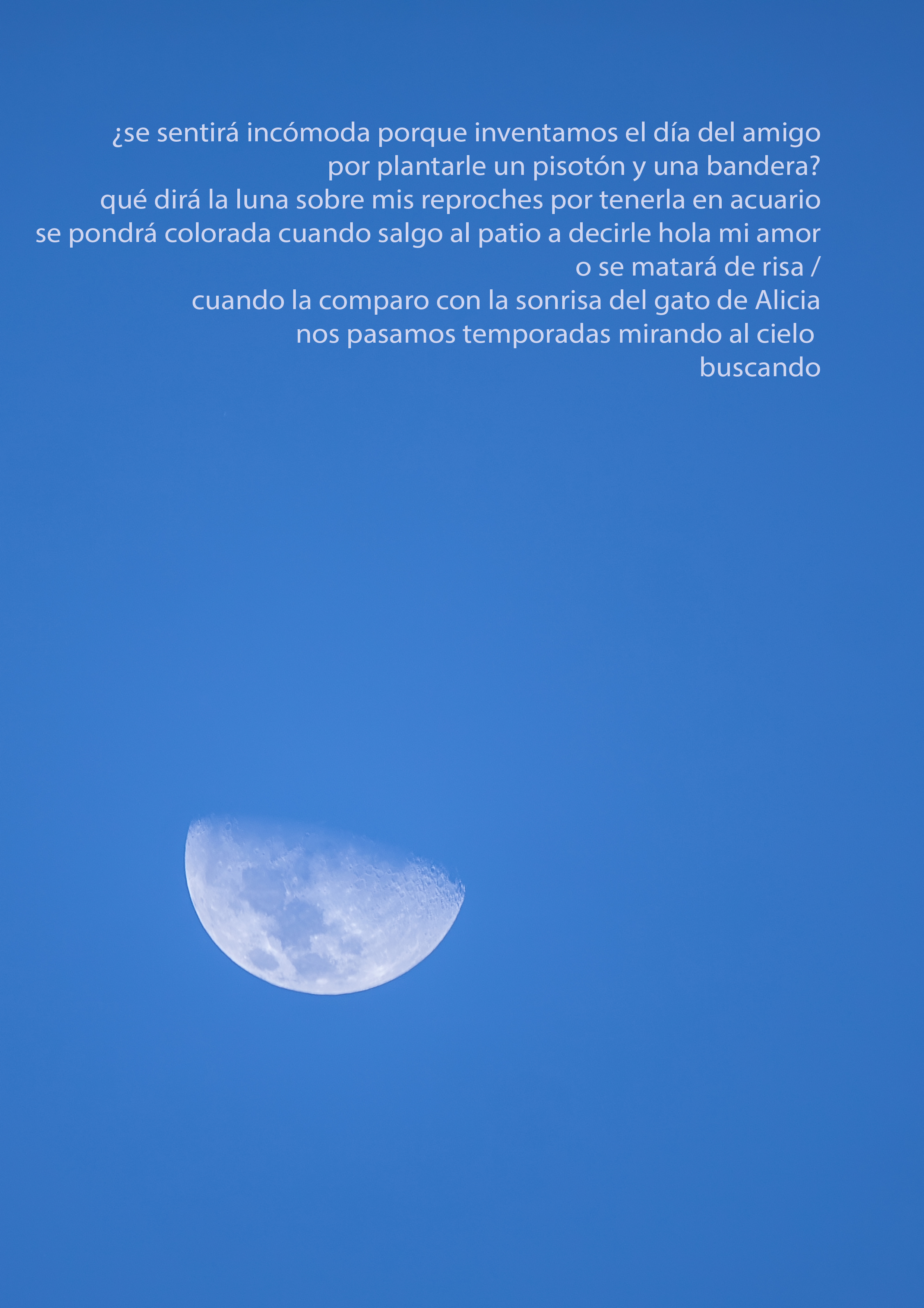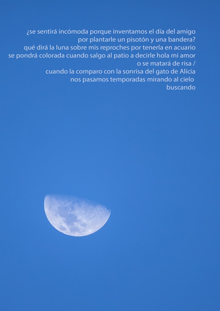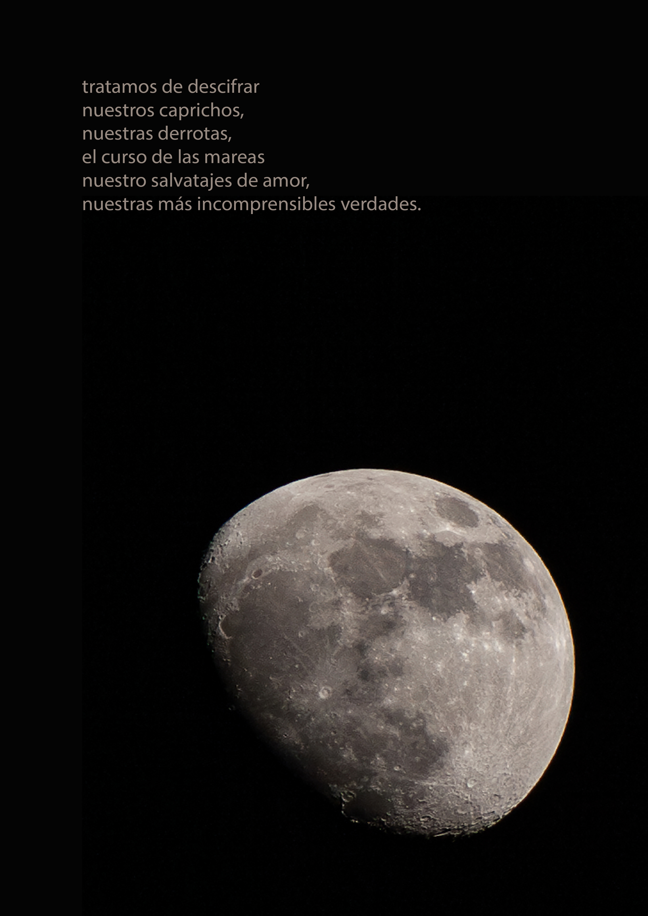 La poesía de Lefi Ramírez y las fotografías de Laura A. Aguirre nos confrontan con nuestra búsqueda de significado bajo la luna. Reflejan anhelos y frustraciones, un diálogo entre incomprensibles verdades y salvatajes de amor. La luna, símbolo de esperanza y desilusión, nos invita a cuestionar si realmente encontramos respuestas en su lumbre espesa. En un mundo lleno de injusticias, miramos al cielo buscando consuelo, mientras la poesía nos recuerda nuestras fracturas expuestas.