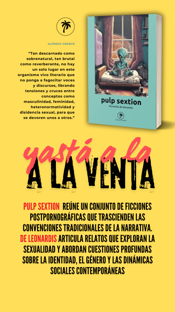 En esta entrevista, Fernando De Leonardis, sociólogo y escritor argentino, nos invita a adentrarnos en su obra Pulp Sextion (Ed. Literatura Tropical, 2024), un conjunto de ficciones post-pornográficas que trascienden las convenciones tradicionales de la narrativa. Con un enfoque en la edición y la corrección, De Leonardis articula relatos que exploran la sexualidad y abordan cuestiones profundas sobre la identidad, el género y las dinámicas sociales contemporáneas.