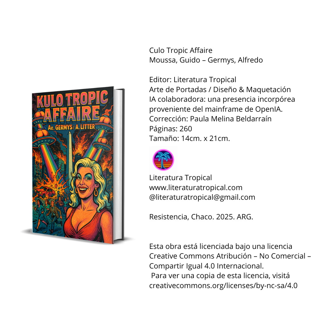 Culo Tropic Affaire no es una novela. Es una invasión estética. Un salmo para tiempos lubricados. Una distopía bañada en glitter que huele a papas fritas, testosterona reciclada y perfume institucional vencido. Acá, la fama sangra. El poder se masturba. Y la verdad… la verdad es un culo flotando sobre el Obelisco, emitiendo pulsos de luz hacia un futuro imposible.