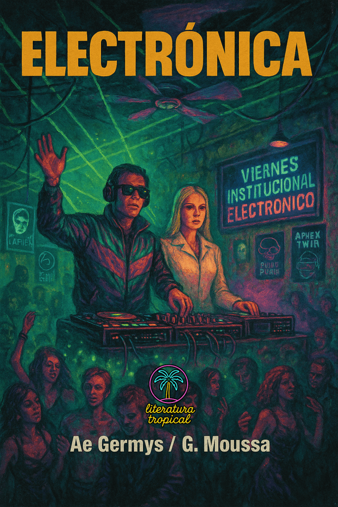 En los márgenes del Chaco institucional, DJs devenidos burócratas, asesores culturales transmutados en predicadores glitch, y fiestas electrónicas financiadas por organismos estatales arman una rave infinita donde se mezclan Prince, Aphex Twin y la Dirección de Cultura. Electrónica es un thriller sintético y filosófico donde el beat es doctrina, el amor se codifica en presets y las pistas de baile se convierten en templos del colapso. Lampernatti y Solimano operan consolas como si fueran armas y declaran la guerra contra el sentido desde una fiesta patrocinada por el Ministerio de Felicidad Pública. Un viaje alucinado por la distopía tropical donde todo suena, todo suda, y todo arde en 128 bpm.